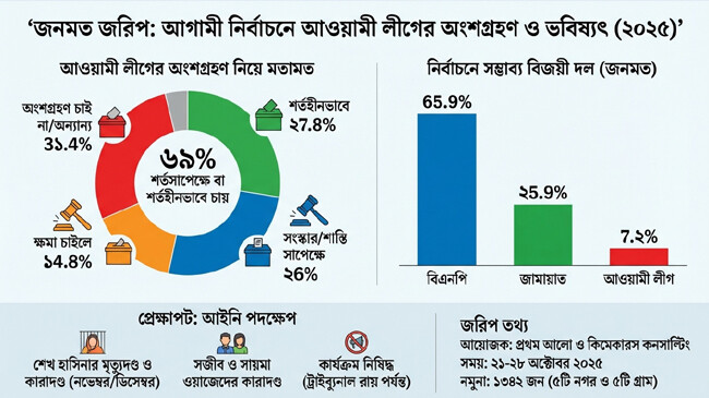 আগামী জাতীয় সংসদ নির্বাচনে আওয়ামী লীগের অংশগ্রহণ নিয়ে জনমনে নানা প্রশ্ন ও কৌতূহল বিরাজ করছে। সাম্প্রতিক একটি জরিপে দেখা গেছে, ক্ষমতাচ্যুত এই রাজনৈতিক দলটিকে শর্তহীনভাবে অথবা বিভিন্ন শর্তসাপেক্ষে নির্বাচনে দেখতে চান প্রায় ৬৯ শতাংশ উত্তরদাতা। তবে একটি উল্লেখযোগ্য অংশ আওয়ামী লীগকে ভোটের মাঠে আর দেখতে চান না।