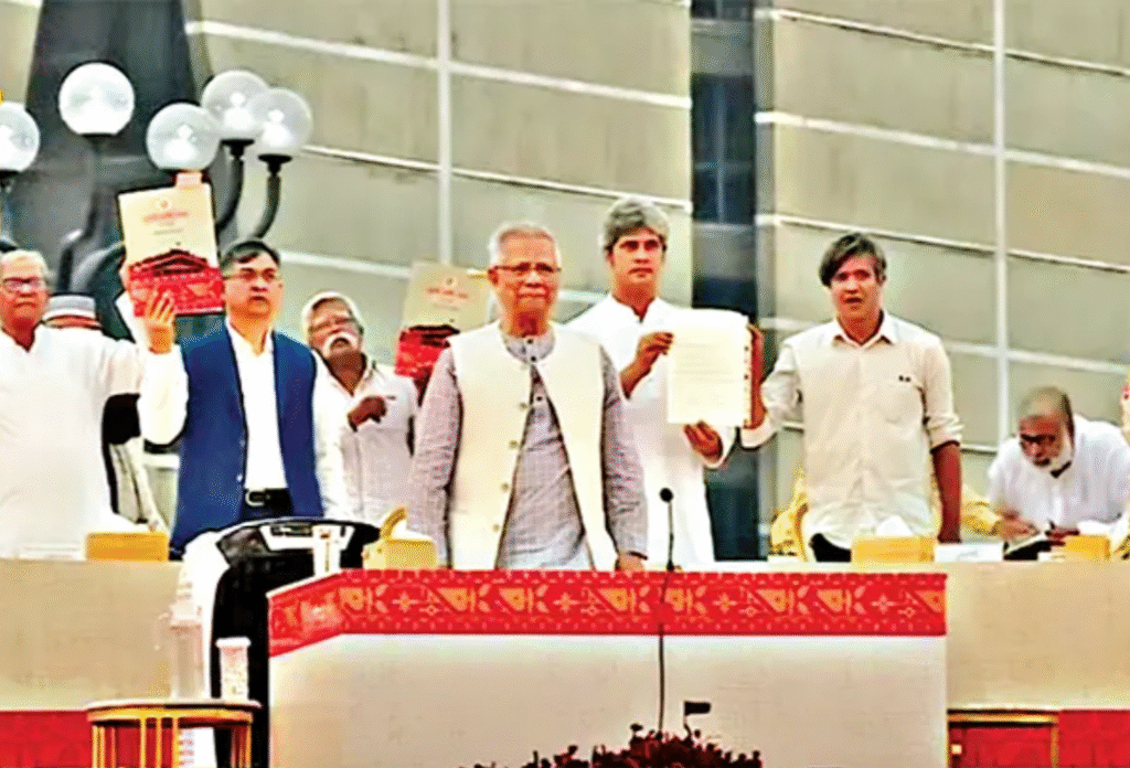 (স্বাক্ষর অনুষ্ঠানের আগে জুলাই যোদ্ধাদের দাবির পরিপ্রেক্ষিতে এ দফা সংশোধন করা হয়। এতে নতুন করে লেখা হয়, ‘শহীদ পরিবারকে এবং জুলাই আহতদের রাষ্ট্রীয় বীর, আহত জুলাই বীর যোদ্ধাদের যথোপযুক্ত সহায়তা প্রদান যেমন মাসিক ভাতা, সুচিকিৎসা, পুনর্বাসন ব্যবস্থা এবং শহীদ পরিবার ও আহত বীরযোদ্ধাদের আইনগত দায়মুক্তি, মৌলিক অধিকার সুরক্ষা ও নিরাপত্তা নিশ্চিত করবো’)।