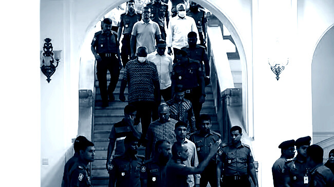 এর আগে, সকাল ৭টার পর সবুজ রঙের ‘বাংলাদেশ জেল প্রিজন ভ্যান’ লেখা একটি গাড়িতে করে তাদের ট্রাইব্যুনালে আনা হয়।