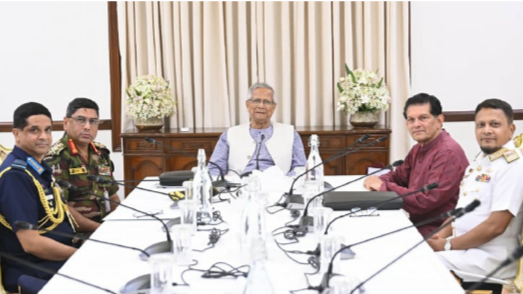 শনিবার সন্ধ্যায় ৭টায় প্রধান উপদেষ্টার রাষ্ট্রীয় বাসভবন যমুনায় সেনাপ্রধান জেনারেল ওয়াকার-উজ-জামান, নৌপ্রধান অ্যাডমিরাল মোহাম্মদ নাজমুল হাসান ও বিমানপ্রধান এয়ার চিফ মার্শাল হাসান মাহমুদ খাঁন প্রধান উপদেষ্টার সঙ্গে এক বৈঠকে এ আলোচনা হয়। বৈঠকে জাতীয় নিরাপত্তা উপদেষ্টা ড. খলিলুর রহমান উপস্থিত ছিলেন।