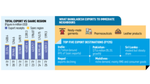 Meanwhile, exports to seven member countries of the South Asian Association for Regional Cooperation (Saarc) stood at just $1.9 billion in FY25, a mere 4.4 percent of the total. The figure was $1.4 billion in FY19.